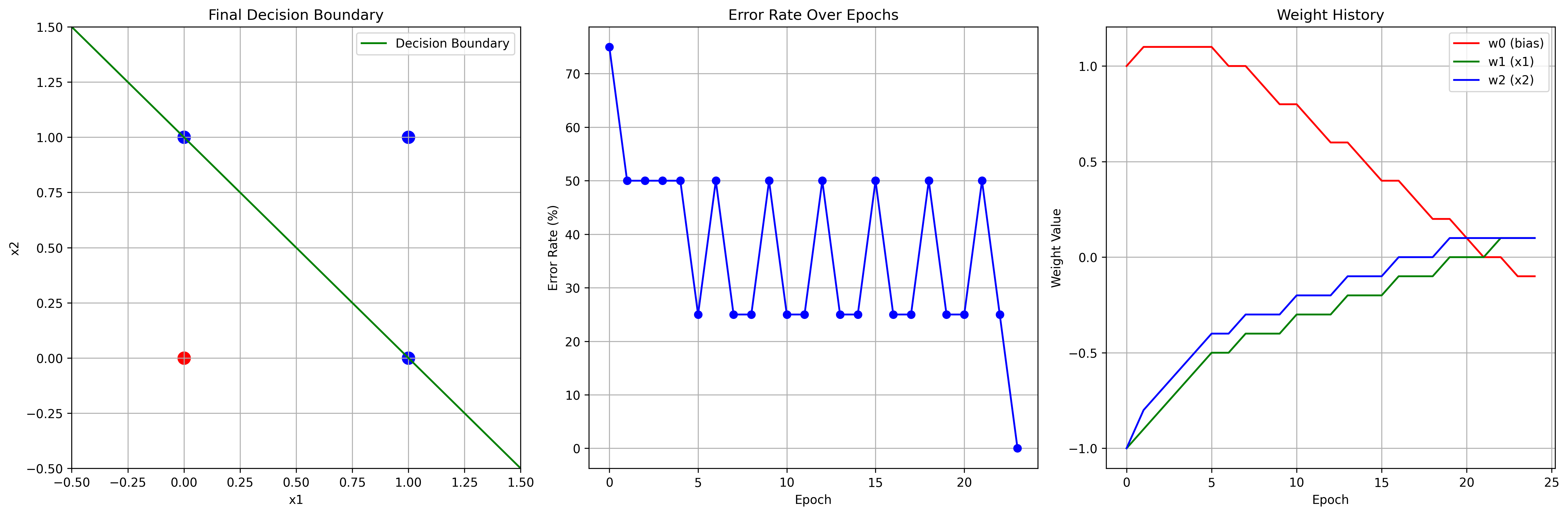Here the visualization of the final decision boundary, the error rate over epochs, and the weight history.